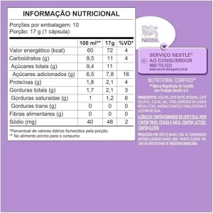 - Alérgenos: Contém derivados de leite, soja e pode conter glúten (trigo, cevada e aveia).